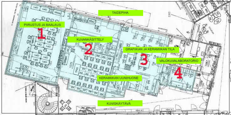RAKENNUS/KUVATAITEEN OPETUSTILAT: opetusta annetaan neljässä erilaisessa työpajatyyppisessä tilassa